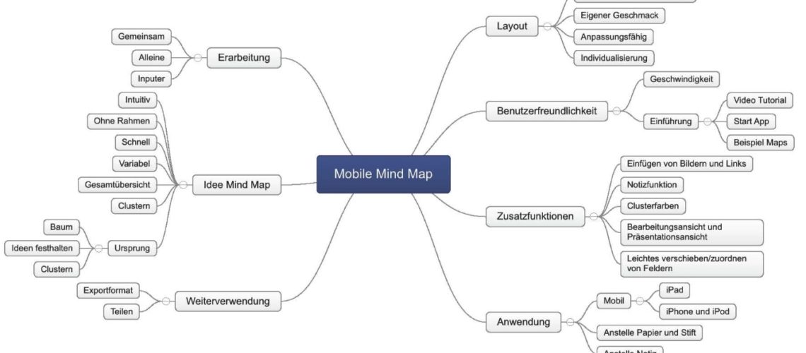 Seit ein paar Monaten erstelle ich Mind Maps unterwegs. Die Suche nach dem perfekten App ist unterhaltsam, aber wenig ergiebig. Ob endlose Auswahl an Helfer bei Mind Maps, Notizen oder to-do Listen: Apps sind Geschmackssache. Und Übungssache. Beim Ausprobieren und Üben habe ich in der Appflut einige Unterschiede festgestellt. Eines müssen die Apps immer sein: leicht zu bedienen, weiterverwendbar und optisch ansprechend.