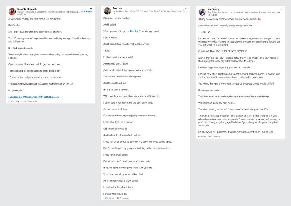 Was bei Facebook schon vor Jahren den Untergang eingeläutet hat und woran wir uns bei Instagram von Anfang an gewöhnt haben, ist nun auch mit LinkedIn passiert: Die einstige «Insel der Seriosität» ist zugespamt, die Timeline eine einzige Müllhalde. Das Abfallprodukt: «persönliche» Geschichten von berührend-traurig bis mutig-inspirierend. Dazu kommt eine Community, die mindestens so sehr auf Lob und Aufmerksamkeit aus ist wie die oft geschmähten Instagram-Influencer – und sich mit Reaktionen und Teilen solcher Posts gegenseitig feiert und in ihrer Bubble selbst zelebriert.