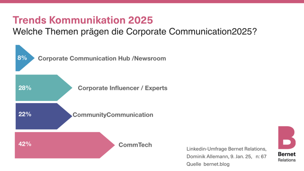 Wir begnügten uns dennoch nicht damit, den feuchten Finger in die Luft zu halten oder ChatGPT nach «Corporate Communication Trends» zu fragen. Wir befragten unsere Linkedin-Community. Die immerhin fast 70 Antworten zeigen, dass wir mit unserem ‚R&D‘ nicht komplett falsch liegen.