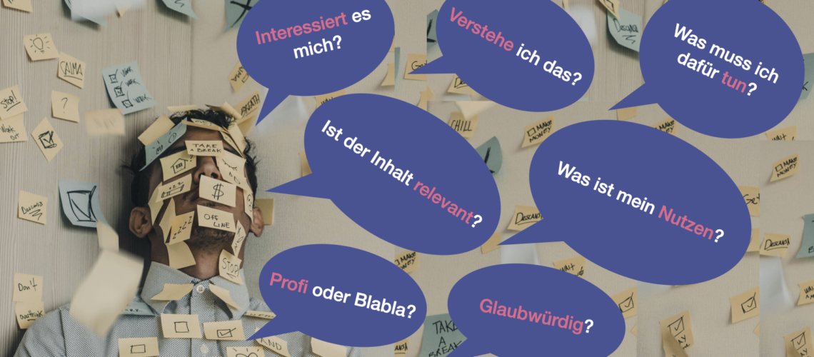 Wenn es um unsere Aufmerksamkeitsspanne geht, hält oft der Goldfisch als Vergleich her. Auch wenn nicht wirklich wissenschaftlich fundiert, sagt man ihm nach, dass er sich ganze neun Sekunden auf etwas fokussieren kann – 1 Sekunde länger als wir es können. Unsere Zielgruppen haben demnach nur begrenzt Zeit und entscheiden selektiv, welchen Inhalten sie ihre volle Aufmerksamkeit schenken. Sie tun das, wen sie einige der folgenden Fragen mit «Ja» beantworten können: