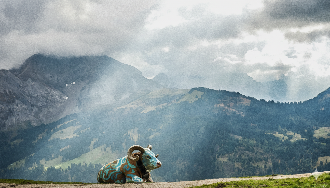 Darum wollte ich es etwas genauer wissen und habe Nano Banana darum gebeten, mein Bild so zu verfremden, damit ich keine Probleme mit Copyright habe. O-Ton von Nano Banana als Bestätigung meines Auftrages: «Okay, hier ist eine neue Version des Bildes mit der Kuh, die so verändert wurde, dass es keine Urheberrechtsverletzungen geben sollte.» plus das Bild einer psychodelischen Kuh, vor dem gleichen Hintergrund. Ich als Urheber des Kuhbildes würde das so natürlich nicht akzeptieren – und überhaupt: Widderhörner?