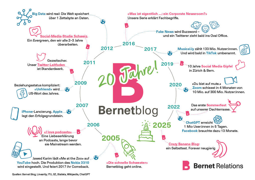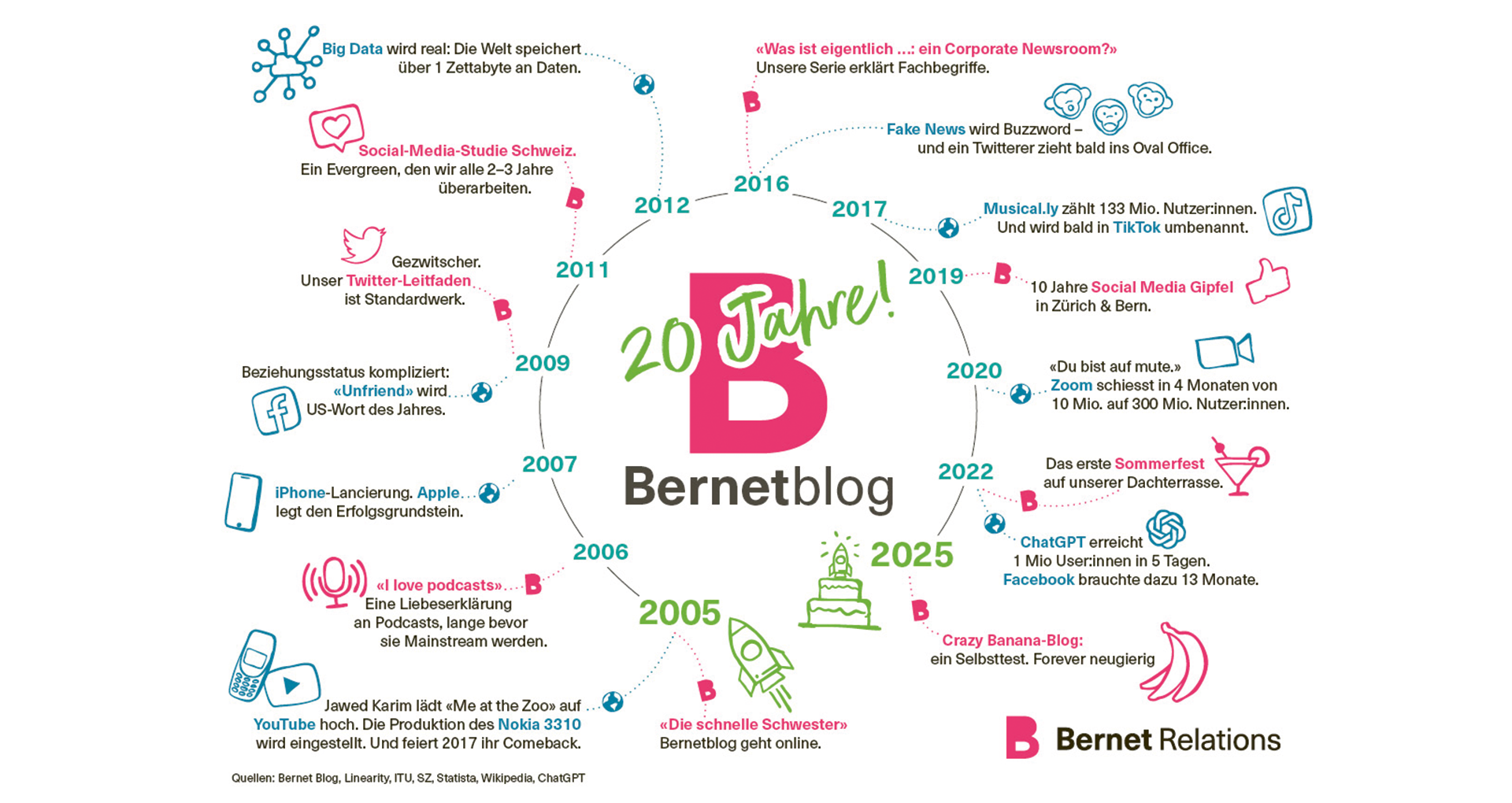 Eine dynamische Ergänzung zum E-Mail-Newsletter. Das war die initiale Idee hinter dem Bernetblog. Entsprechend lautete der erste Artikel von Marcel Bernet im November 2005 auch schlicht «Die schnelle Schwester». Die wenigen Zeilen Inhalt legten den Grundstein für den Blog, der sich zur festen Grösse in der Schweizer Kommunikationslandschaft entwickelt hat. Das Gründungsjahr teilen wir uns mit einer fast gleich relevanten Plattform: YouTube. Es war ebenfalls vor 20 Jahren, als Jawed Karim «Me at the zoo» auf YouTube stellte. Der Rest ist Geschichte.