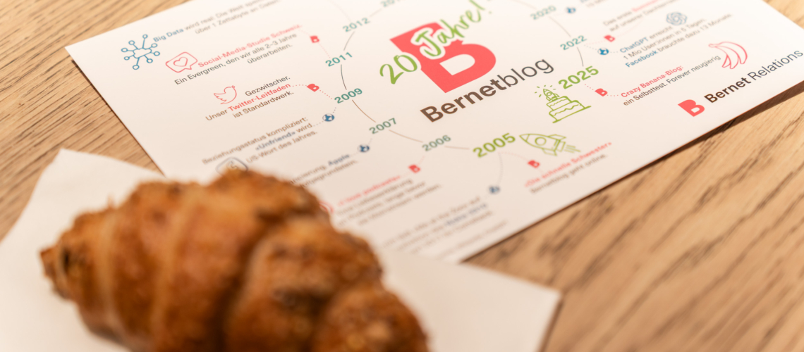 20 Jahre Bernetblog, das ist schon mal eine Ansage und über 3000 Artikel berichteten (und berichten weiter) zu Aktuellem aus der Welt der Kommunikation und unserer Agentur. Von der Schnellen Schwester bis zur verrückten Banane war alles dabei. Anlässlich des 80. (!) Social Media Gipfels, am 5.November, teilten 46 wunderbare, lernwillige und neugierige Teilnehmende ihr prägendstes Erlebnis der letzen 20 Jahre mit uns. Wir haben die Beiträge ausgewertet, und claude.ai (mit anonymisierten Daten) gebeten, uns beim Clustern zu helfen. Aus dem Resultat nachfolgend ein spannender Rückblick aus dem Universum aller Antworten und natürlich – Fanfare! – die Bekanntgabe der Gewinner*innen unseres Wettbewerbs.